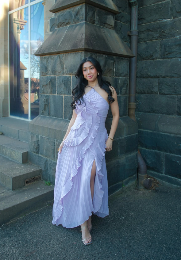 Step into refined femininity with the Emma Maxi Dress, where architectural pleats meet soft, flowing movement. Designed for elegant occasions and unforgettable moments, it enhances your natural poise with its one-shoulder silhouette and cascading ruffle detailing. Ideal for weddings, garden parties, or special celebrations, it’s a dress that makes every entrance unforgettable.